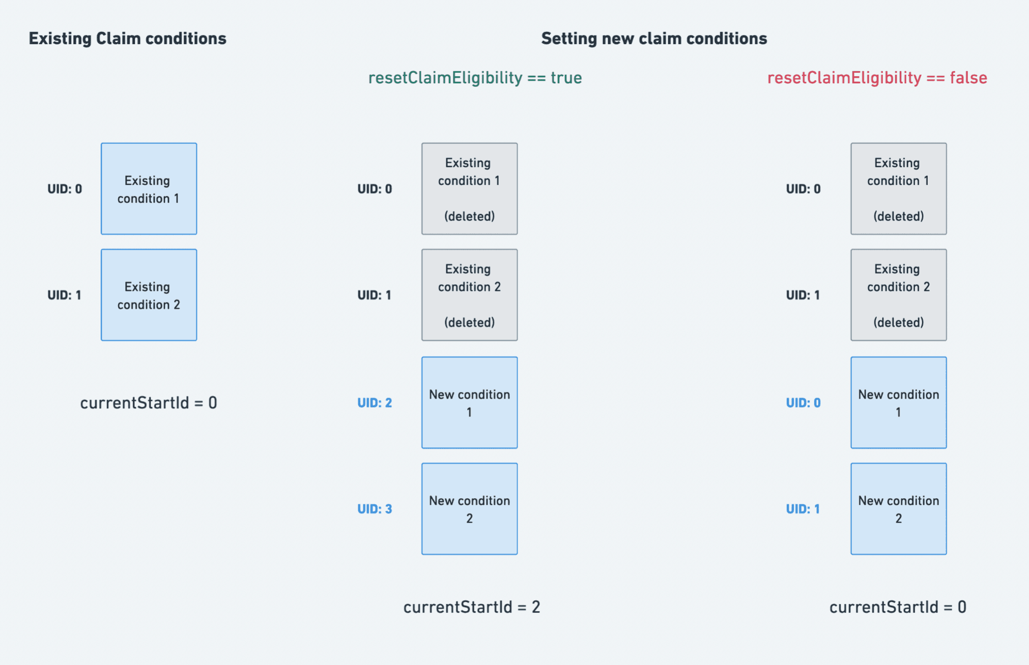 When setting claim conditions, any existing set of claim conditions stored in ClaimConditionsList